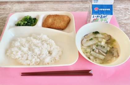 【ごはん、たらフライ、すまし汁、こまつなのごまあえ、牛乳】