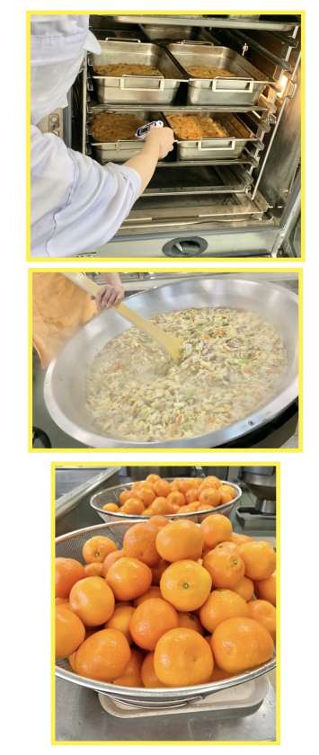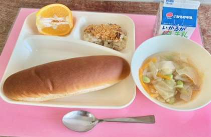 【黒糖パン、押麦のグラタン、豚肉と野菜のスープ、いよかん、牛乳】