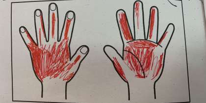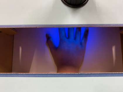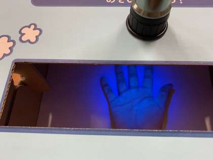 1年間の活動報告と「正しい手洗いをしよう」をテーマに手洗い実験を行いました。手洗い実験では、手洗いチェッカー専用クリームを手に塗り、4つの班(A班:水で手を流す、B班:水で10秒くらい手を洗う、C班:石けんをつかい、10秒くらい手を洗う、D班:石けんを使い、30秒かけて正しく手を洗う)に分かれて、洗い残しを見てみました。
