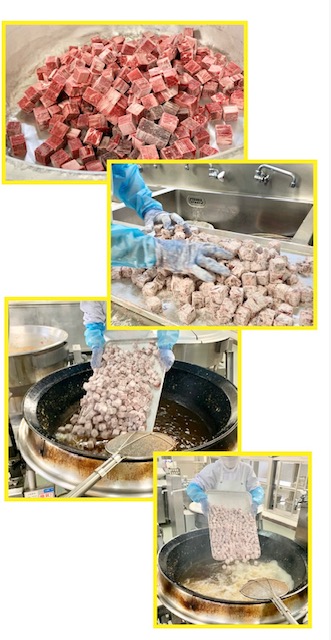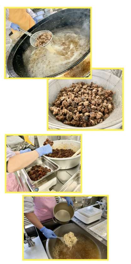 くじらのオーロラ煮は、しょうが汁、料理酒で下味をつけたくじらに、でんぷんをまぶしてあげ、ケチャップ、砂糖、赤みそで作ったタレをからませています。(写真2〜8枚目)