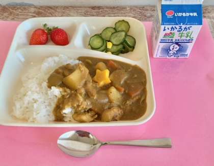 【チキンレバーカレーライス、きゅうりとコーンのサラダ、いちご、牛乳】