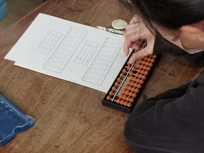 1日目は、そろばんの歴史や見取り算を学びました。珍しい昔の時代のそろばんや外国のそろばんを実際に見せてくださり、子ども達は興味深そうに話を聞いていました。