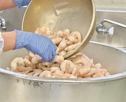 えびのチリソースいためは、料理酒で下味をつけたえびとたまねぎをしょうが、にんにく、白ねぎ、トウバンジャンで香りよくいため、砂糖、こいくちしょうゆ、ケチャップで味つけしています。水どきでんぷんでとろみをつけ、味がからむようにしています。(写真2枚目)