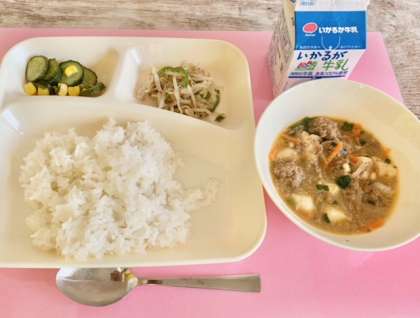【ごはん、マーボーどうふ、きゅうりとコーンの甘酢あえ、もやしとピーマンのごまいため、牛乳】