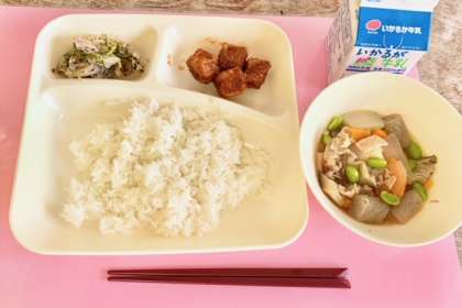 豚肉と野菜の煮ものは、豚肉を主材に、しいたけで旨みを出し、じゃがいも、つなこんにゃく、たまねぎ、にんじん、青みにえだまめを使用しています。(写真2枚目)