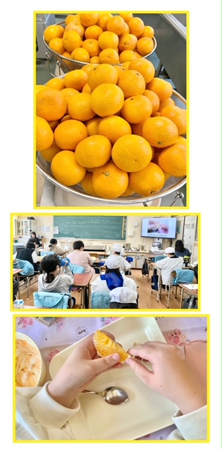 あまなつかんは、和歌山県産で、1人1/4切れずつです。上手に皮をむいて食べるためのスライドを見ながら食べました。(写真5〜7枚目)