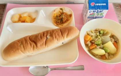 【レーズンパン、豚肉と野菜のカレースープ煮、変わりピザ、ミックスフルーツ(缶)、牛乳】