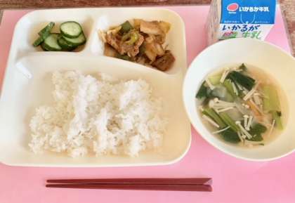 【ごはん、ホイコウロー、中華スープ、きゅうりのピリ辛あえ、牛乳】