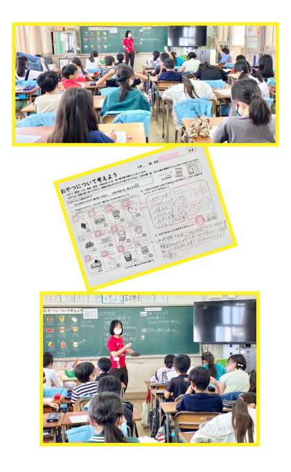 4年生は食に関する指導で、おやつについて学びました。おやつの目安である200キロカロリーを軸に、おやつをとる場合にどのようなことに気をつけたら良いのかを考えました。栄養成分表示を見て、おやつに含まれるエネルギー量を確認することができることを知り、「今度スーパーで見てみる!」「いつも200キロカロリーこえてる気がする!」などの声があがりました。