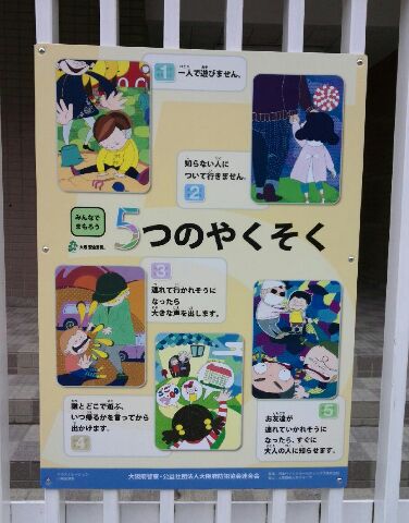 正門には「5つのやくそく」を掲示しています。安全のために守ってほしいやくそくです。