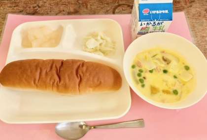 【黒糖パン、かぼちゃのクリームシチュー、キャベツのゆずドレッシング、和なし(カット缶)、牛乳】