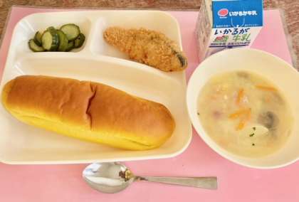 【パンプキンパン、サーモンフライ、豆乳スープ、きゅうりのバジル風味サラダ、牛乳】