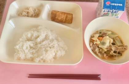 【ごはん、中華煮、あつあげのピリ辛じょうゆかけ、もやしの中華あえ、牛乳】