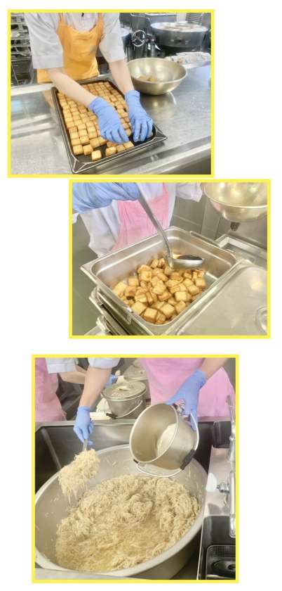 あつあげのピリ辛じょうゆかけは、焼き物機で焼いたあつあげに、砂糖、こいくちしょうゆ、トウバンジャンを合わせたタレを配缶時にかけています。(写真5、6枚目)