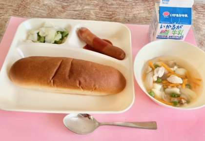 【黒糖パン、ウインナーのケチャップソース、スープ、キャベツとさんどまめのサラダ、牛乳】