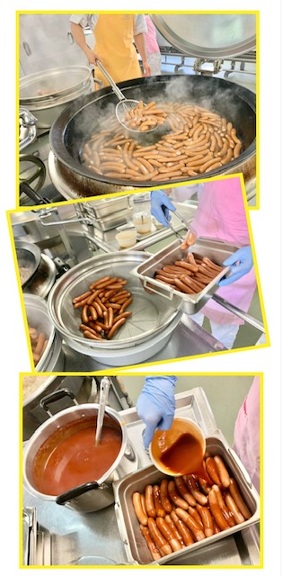 ウインナーのケチャップソースは、ウインナーソーセージに砂糖、ケチャップ、トンカツソース、ウスターソースを合わせて煮、でんぷんでとろみをつけたソースをかけています。(写真2〜4枚目)