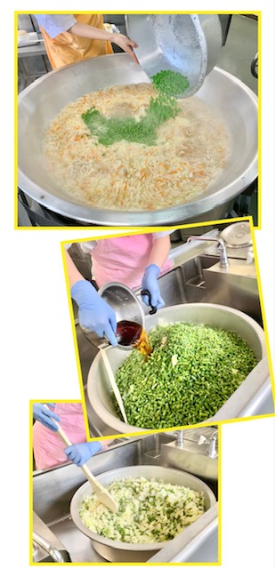 キャベツとさんどまめのサラダは、キャベツとさんどまめに、砂糖、塩、米酢、うすくちしょうゆ、綿実油で作ったドレッシングをかけ、あえています。(写真6、7枚目)