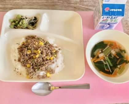 【3色丼、3色スープ、3色酢のもの、牛乳】
