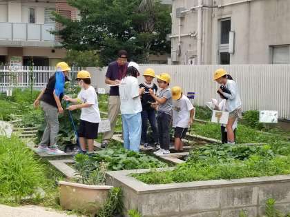 7月3日(月)に、4年生の理科の出前授業で、学校の生き物探しをしました。大阪市環境局の方々と一緒に『生き物調査隊』となって、学習園や運動場の周りなど、色々な場所にいる昆虫や鳥、植物などを班ごとに調査しました。クラスみんなで100種類以上の生き物を見つけて、子ども達は大変喜んでいました。