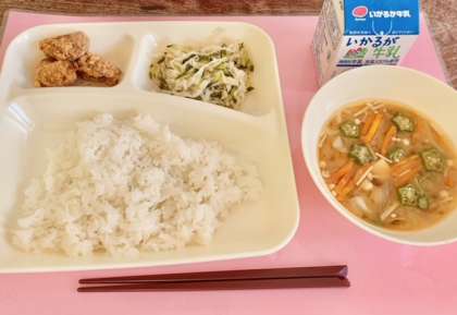 【ごはん、豚肉のたつたあげ、みそ汁、切干しだいこんのゆずの香あえ、牛乳】