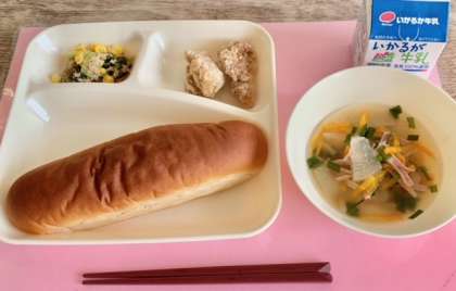 【黒糖パン、鶏肉のからあげ、とうがんの中華スープ、ツナとチンゲンサイのいためもの、牛乳】