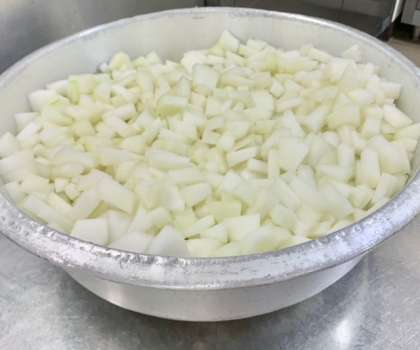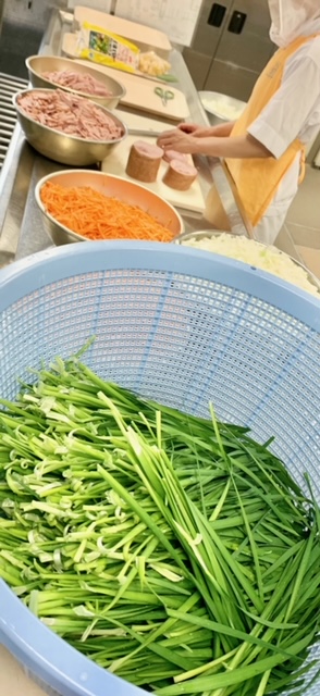とうがんの中華スープは、ハムを主材に、夏が旬のとうがん(写真2枚目)、たまねぎ、にんじん、青みににらを使用しています。(写真3枚目)
