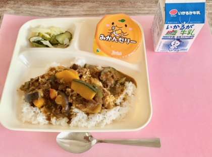 【夏野菜のカレーライス、キャベツときゅうりのサラダ、みかんゼリー、牛乳】
