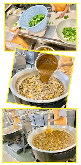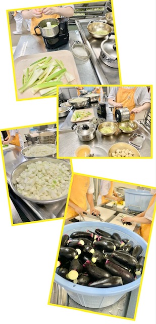 夏野菜のカレーライスは、夏野菜のかぼちゃ、なす、ピーマンなどを使用していて、夏を感じることができます。たくさんの野菜を使用していますが、野菜嫌いの人にも食べやすく、子どもたちにも教職員にも人気のカレーライスです。(写真2〜8枚目)