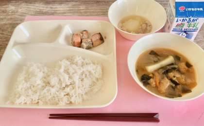 【ごはん、さけのつけ焼き、みそ汁、とうがんの煮もの、牛乳】