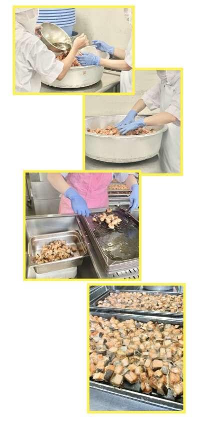 さけのつけ焼きは、角切りのさけに、料理酒、砂糖、こいくちしょうゆで下味をつけ、焼き物機で焼いています。(写真2〜5枚目)