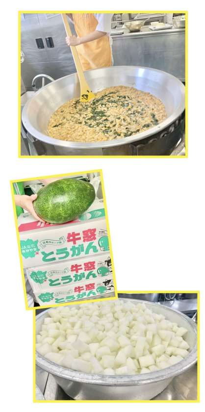 とうがんは、きゅうりなどと同じ仲間の野菜です。夏が旬ですが、そのまま風通しのよい暗いところに置いておくと、冬まで食べることができるので、「冬」の「瓜」と書いて「冬瓜(とうがん)」という名前がつけられました。今日は岡山県産のとうがんを使用しました。