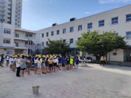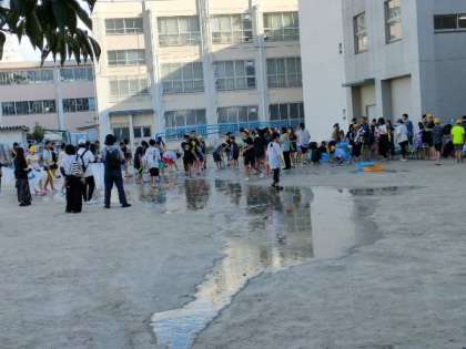 まず、運動場で、開会式を行い、その後スーパーボールすくいや水遊びをしました。