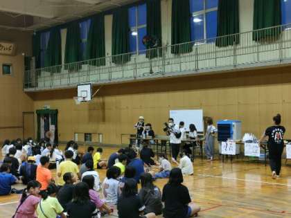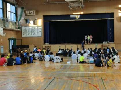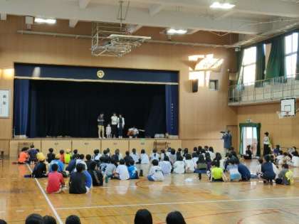 運動場で楽しんだ後、着替え、講堂で子どもたちや教員の出し物をしたり、ビンゴをしたりしました。途中で、食事もしました。