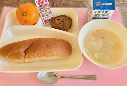 【黒糖パン、焼きハンバーグ、豆乳スープ、冷凍みかん、牛乳】