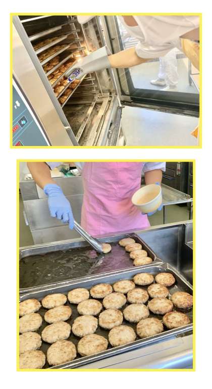 焼きハンバーグは、焼き物機で焼いたハンバーグに自分でケチャップをかけていただきます。(写真2、3枚目)