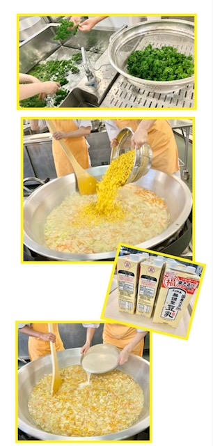 豆乳スープは、じゃがいも、たまねぎ、キャベツ、コーン、にんじん、青みにパセリを使用し、仕上げに豆乳を使用したスープです。(写真4〜7枚目)