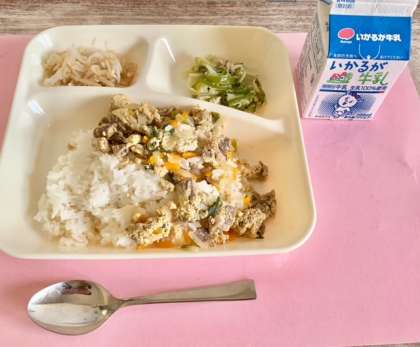 【他人丼、ささみと野菜のいためもの、もやしの甘酢あえ、牛乳】