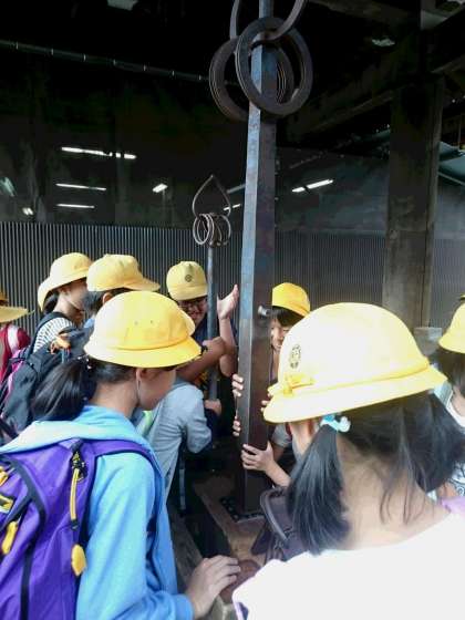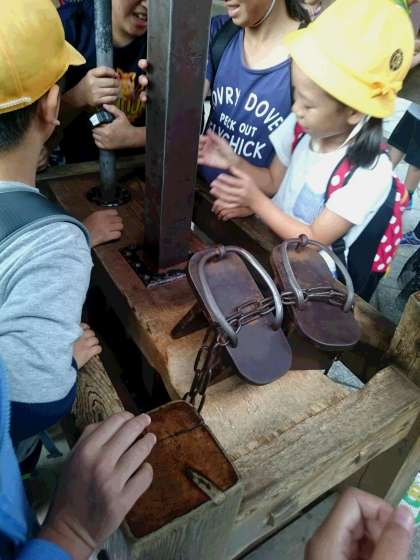 まず入ってすぐにある、鉄の錫杖と鉄の下駄を持ち上げて試していました。