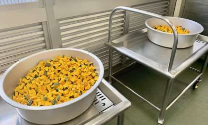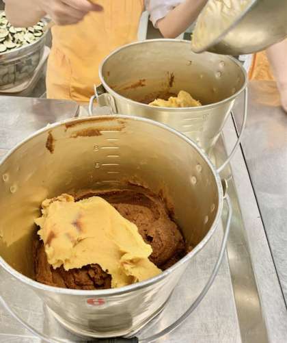 かぼちゃのみそ汁は、うすあげ、かぼちゃ、たまねぎ、彩りにこまつなを使用したみそ汁です。みそ汁のみそは、合わせみそではなく、赤みそと白みそを別々で納品して使っています。今日は、甘みの出るかぼちゃとたまねぎを使っているので、赤みその割合を多くしています。(写真2、3枚目)