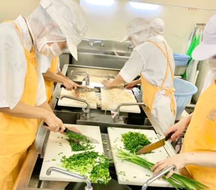 中華みそスープは、鶏肉を主材に、もやし、コーン、にら、しいたけを使用し、赤みそなどで味つけしています。(写真2、3枚目)
