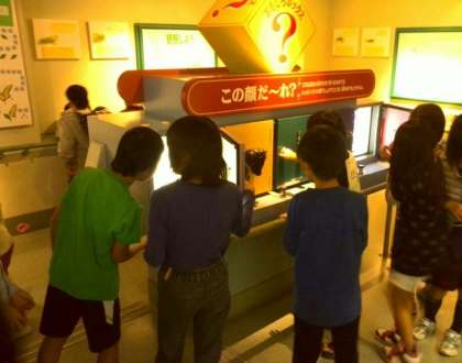 昆虫館で、いろんな昆虫や展示物をみて、体験中です。