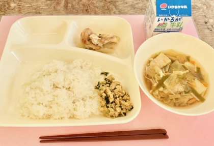 【ごはん、鶏肉のゆず塩焼き、ソーキ汁、ツナ大豆そぼろ、牛乳】