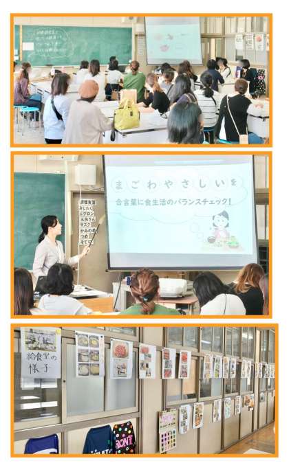 献立の合言葉「まごわやさしい」についての講話に加えて、大阪市の学校給食と新高小学校の給食調理室の様子について紹介しました。