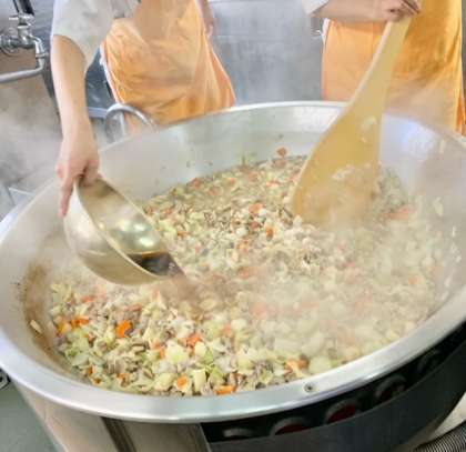 豚肉と野菜のスープ煮は、豚肉を主材に、じゃがいも、たまねぎ、キャベツ、にんじん、マッシュルーム、青みにグリンピースを使用した煮ものです。(写真2枚目)