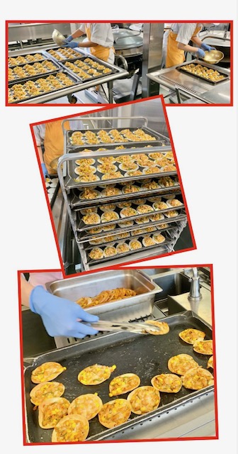変わりピザは、ツナ、コーン、ピーマン、ピザソース、チーズを混ぜ合わせて、ぎょうざの皮にのせ、焼き物機で焼いています。700個の変わりピザを焼きました。(写真3〜5枚目)