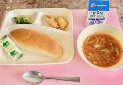 【コッペパン、ソフトマーガリン、白身魚フリッター、ミネストローネ、ブロッコリーのサラダ、牛乳】