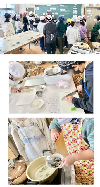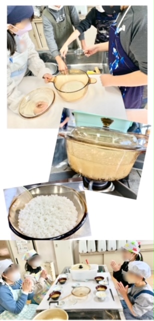 5年生は家庭科の調理実習で、ごはんとみそ汁を作りました。みそ汁のみそは、7月に出前授業で自分たちで作ったみそを使いました。仕込んだ時とは色や風味が変わっていて、子どもたちも驚いていました。