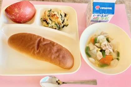 【黒糖パン、ほうれんそうのグラタン、スープ煮、りんご、牛乳】