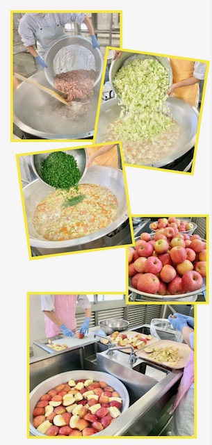 スープ煮は、鶏肉、だいこん、キャベツ、にんじん、コーン、青みにさんどまめを使用した洋風の煮ものです。(写真6〜8枚目)