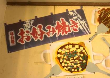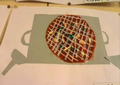2年生が図工の時間にうまそーなお好み焼きを作ってくれたんで、みんなにもみせたろかなー思ってん。
